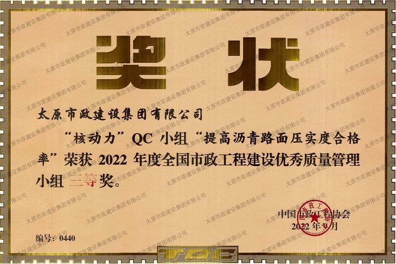 2022年度全國市政工程建設優(yōu)秀質量管理小組三等獎_''核動力QC小組”提高瀝青路面壓實度合格率”